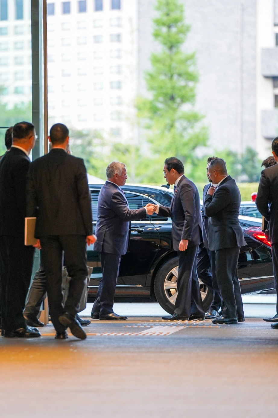 رئيس الوزراء الياباني فوميو كيشيدا في استقبال جلالة الملك عبدالله الثاني وسمو الأمير الحسين بن عبدالله الثاني، ولي العهد، لدى وصولهما إلى مقر رئاسة الوزراء في طوكيو