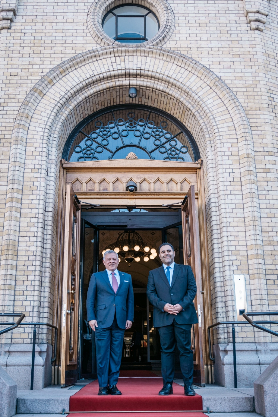 His Majesty King Abdullah II is received by Norway Prime Minister Jonas Gahr Støre upon arrival at the Government Guest House in Oslo