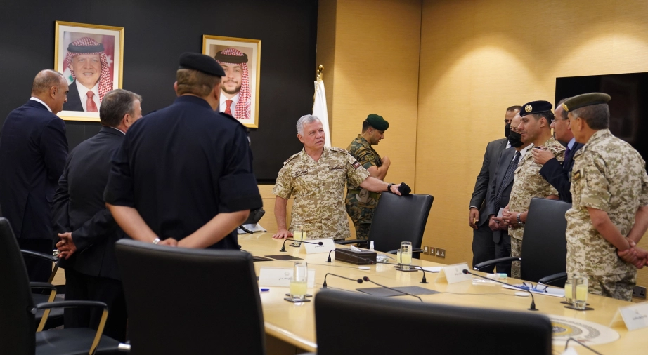 His Majesty King Abdullah chairs a meeting at the National Centre for Security and Crisis Management to check on the latest developments of the gas leak incident in Aqaba, attended by His Royal Highness Crown Prince Al Hussein via telepresence from Aqaba