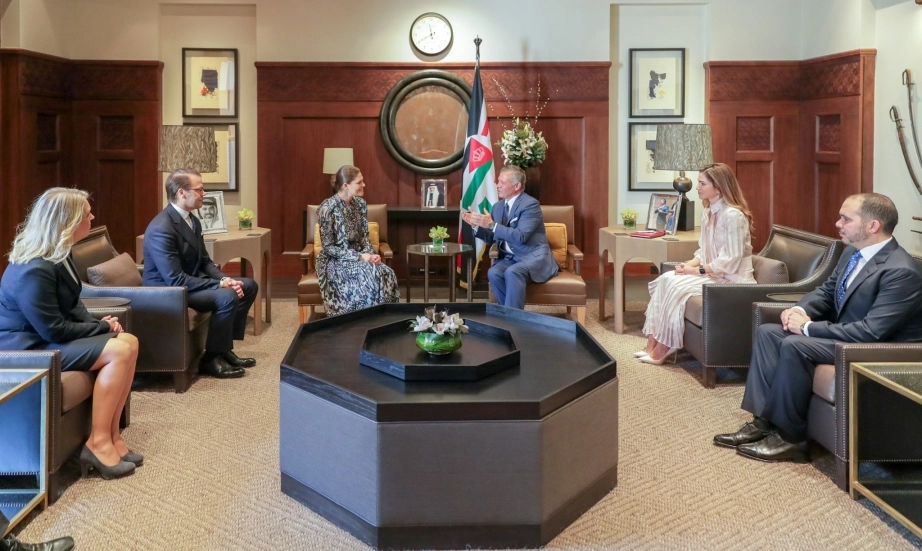 جلالة الملك عبدالله الثاني وجلالة الملكة رانيا العبدالله يستقبلان الأميرة فيكتوريا ولية عهد السويد والأمير دانيال