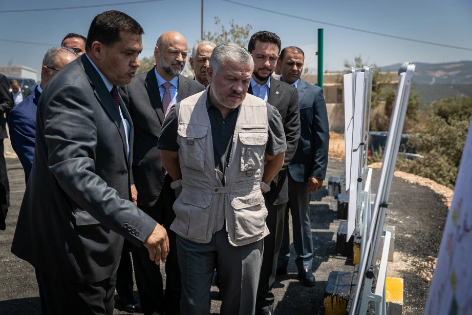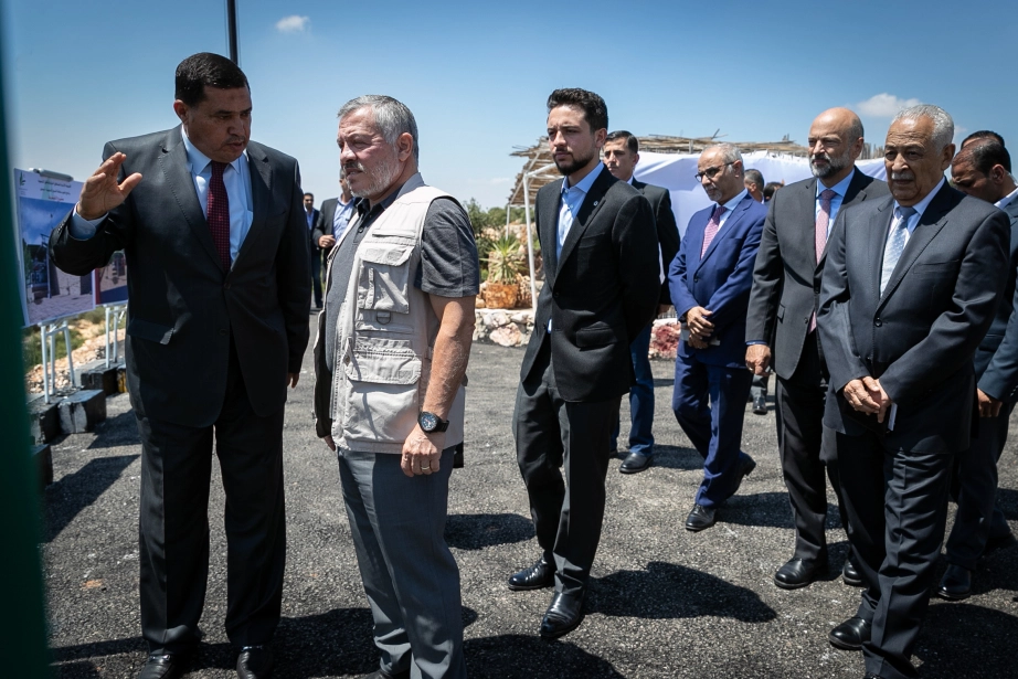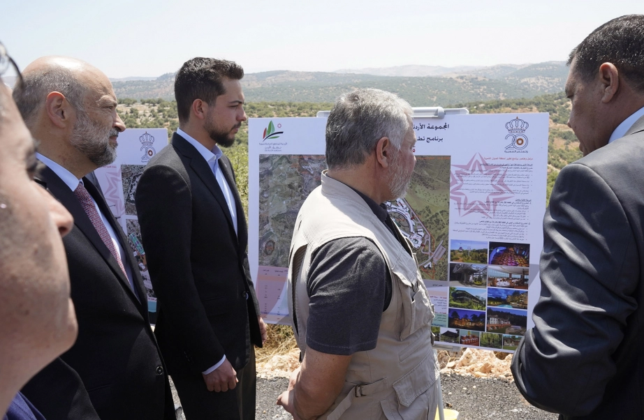 جلالة الملك عبدالله الثاني، يرافقه سمو الأمير الحسين بن عبدالله الثاني ولي العهد، يطلع على تصاميم مسار خط تليفريك عجلون