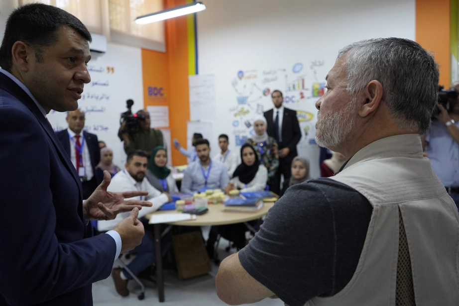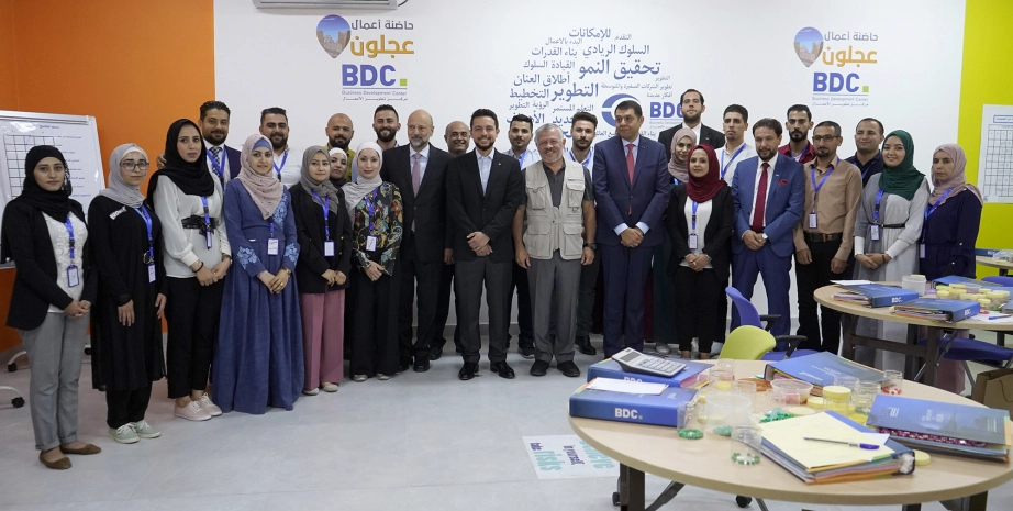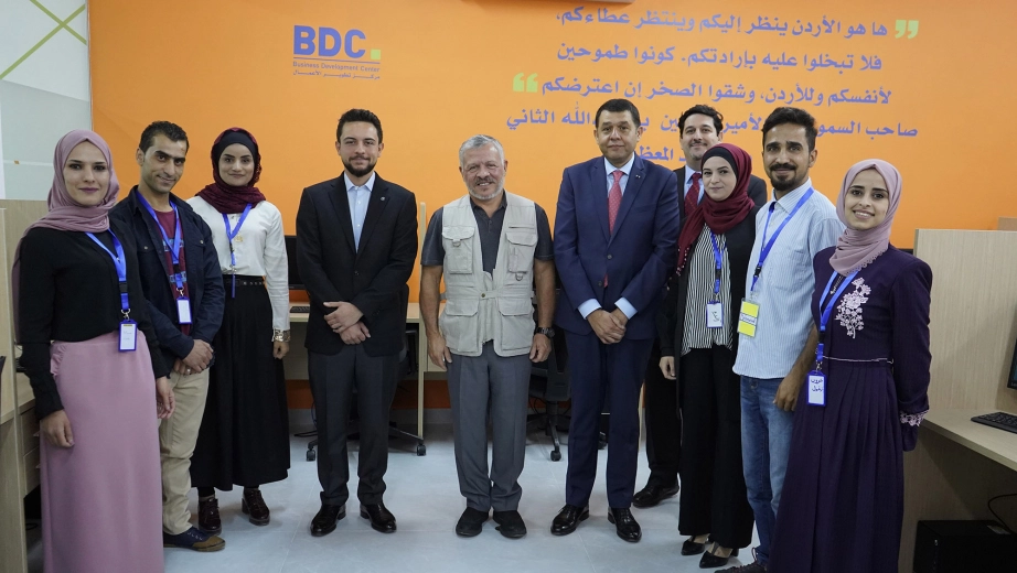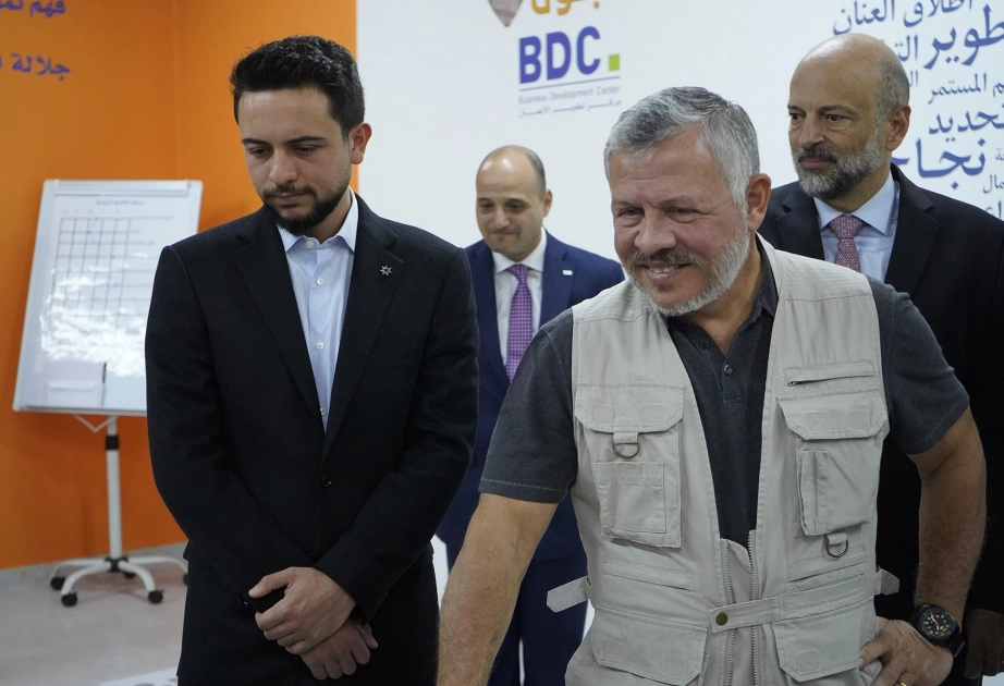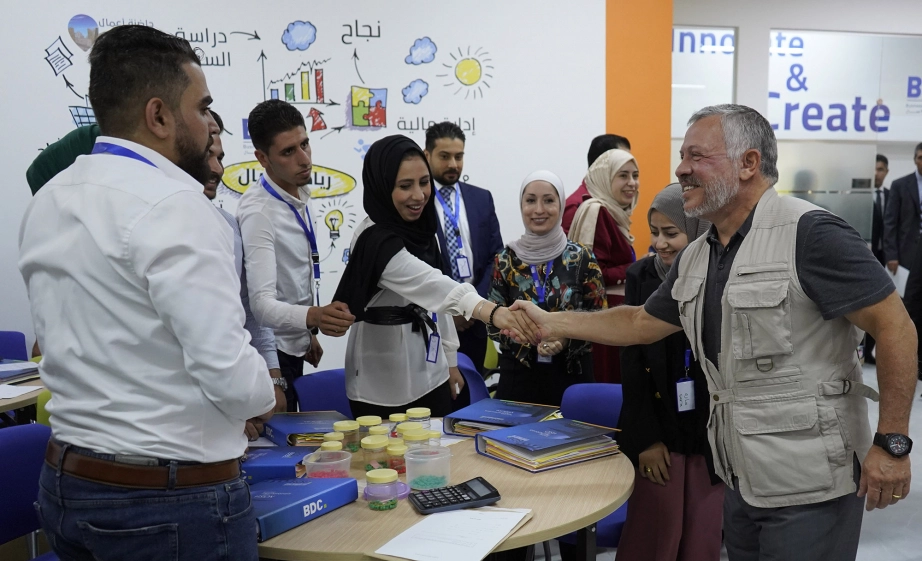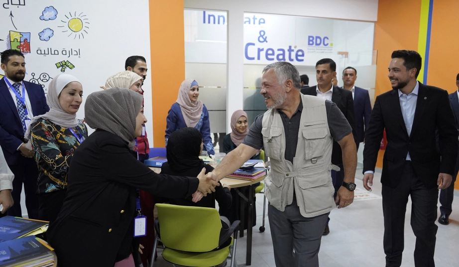 جلالة الملك عبدالله الثاني، يرافقه سمو الأمير الحسين بن عبدالله الثاني ولي العهد، يتفقد حاضنة أعمال عجلون/ مركز تطوير الأعمال