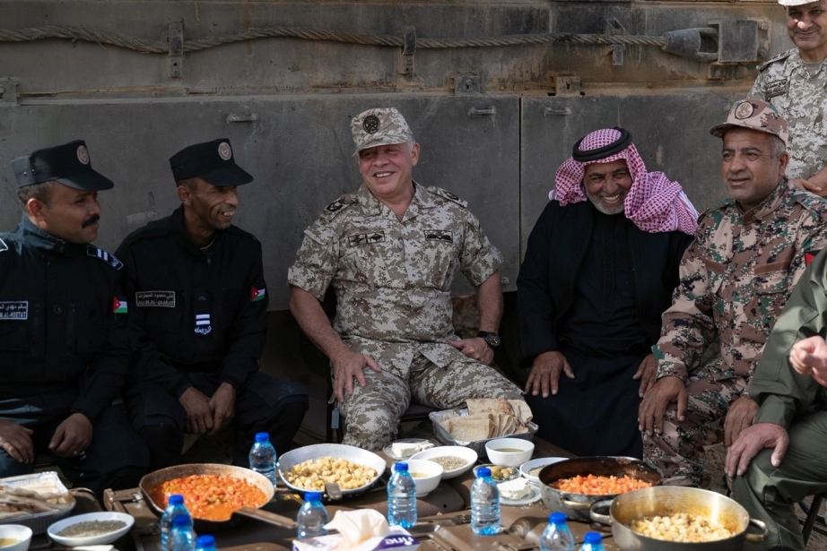 His Majesty King Abdullah II, the Supreme Commander of the Jordan Armed Forces-Arab Army, meets with retired brothers in arms who served with His Majesty on the Second Royal Armoured Battalion, and joins them for breakfast