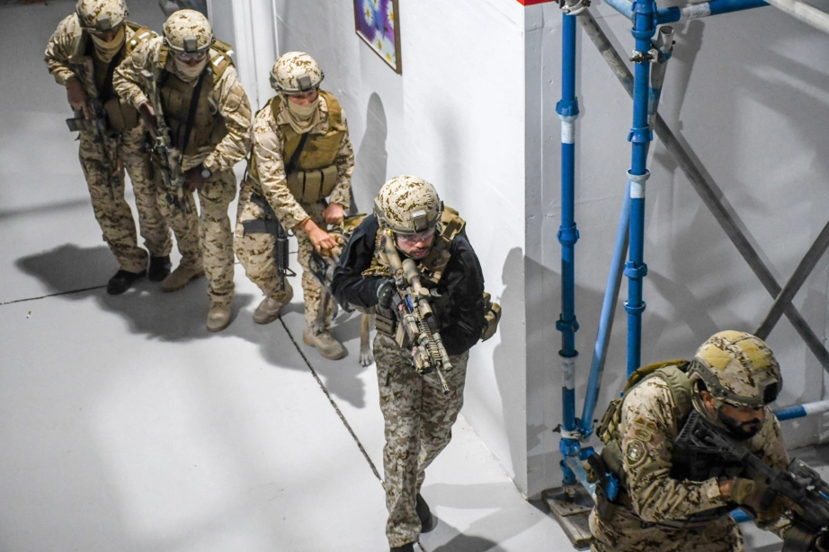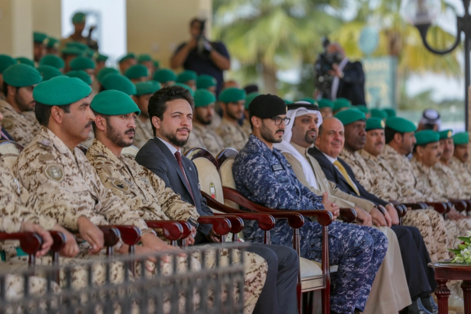 His Royal Highness Crown Prince Al Hussein bin Abdullah II and Bahrain Royal Guard Commander Major Gen. Sheikh Nasser bin Hamad Al Khalifa attend a military drill conducted by Bahrain Royal Guard units and participate in part of it