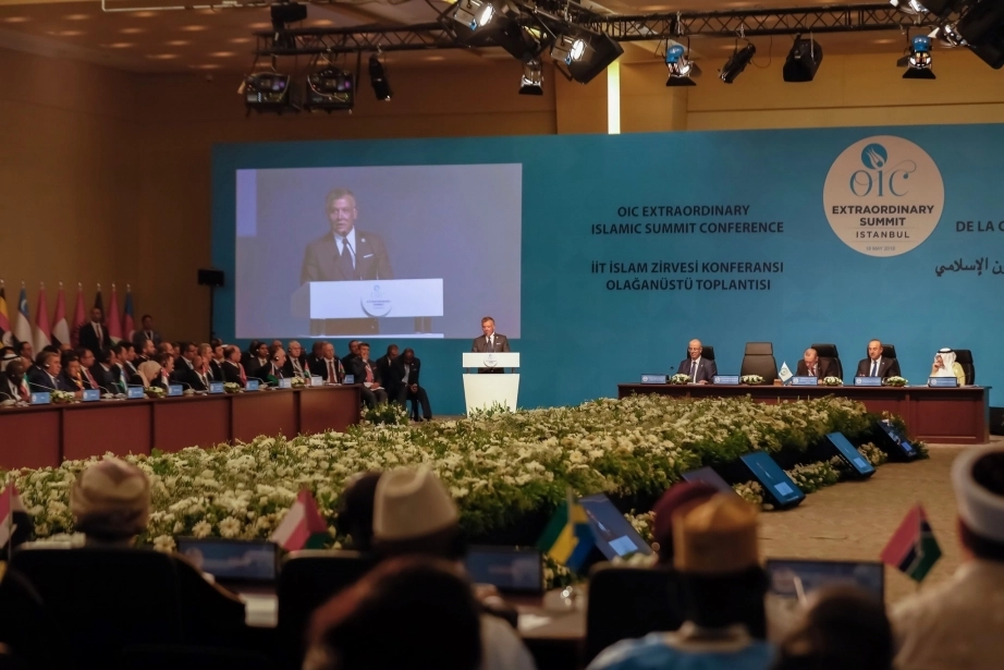 His Majesty King Abdullah II delivers a keynote speech at the opening session of the Organisation of Islamic Cooperation’s Extraordinary Summit in Istanbul