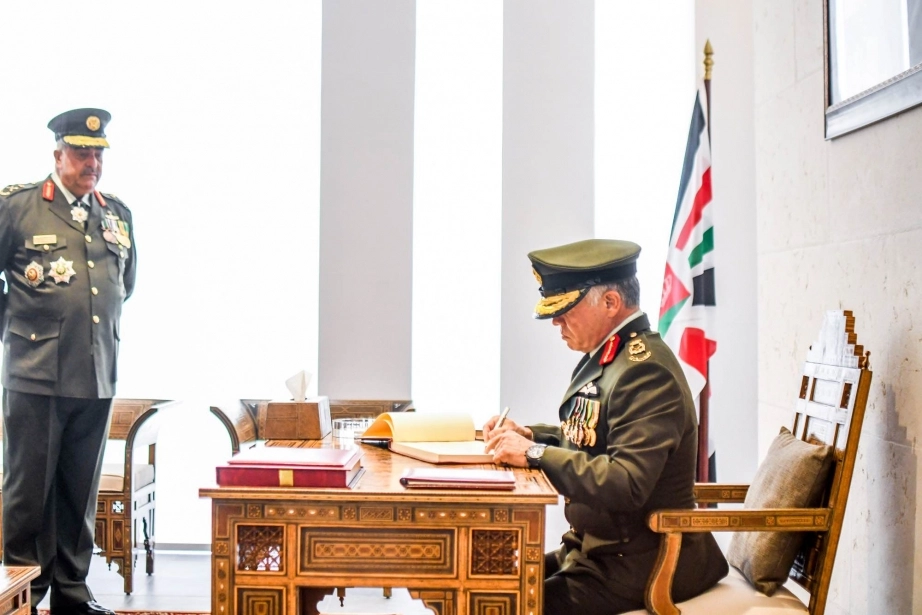 His Majesty King Abdullah II, the Supreme Commander of the Jordan Armed Forces-Arab Army, signs the guestbook at the Martyr’s Memorial