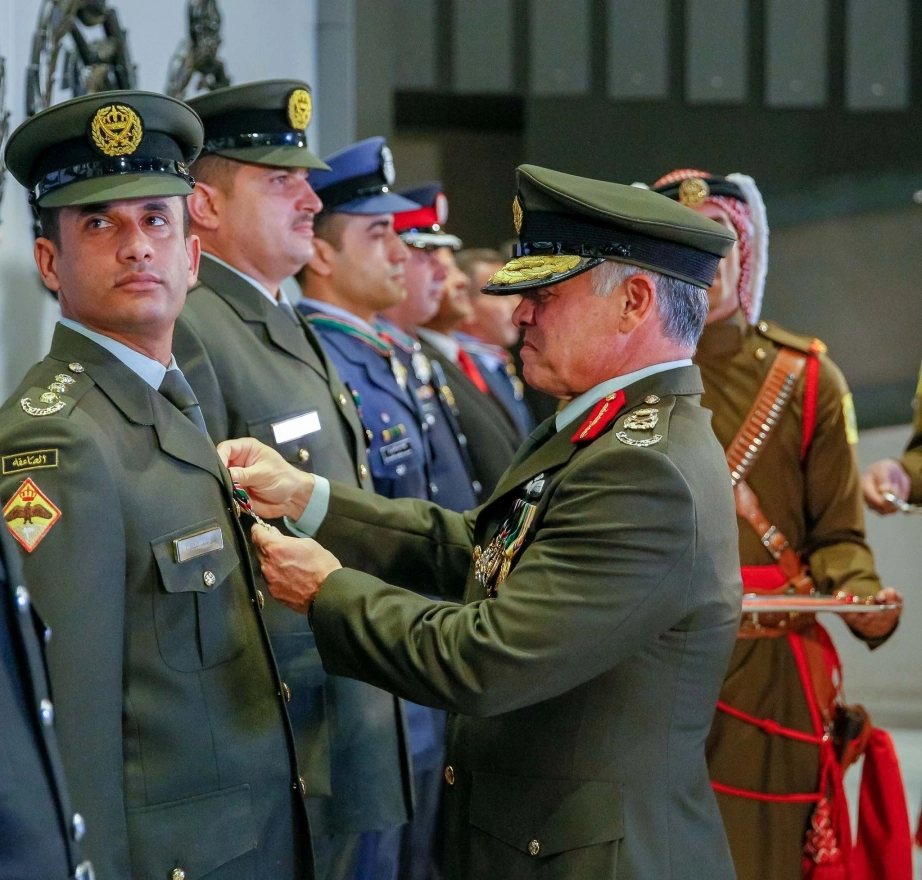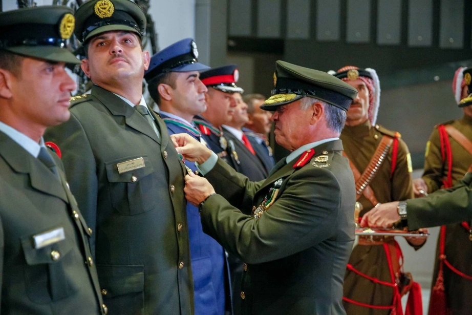 His Majesty King Abdullah, the Supreme Commander of the Jordan Armed Forces-Arab Army, bestows medals on a number of military and security personnel for their outstanding performance while on duty