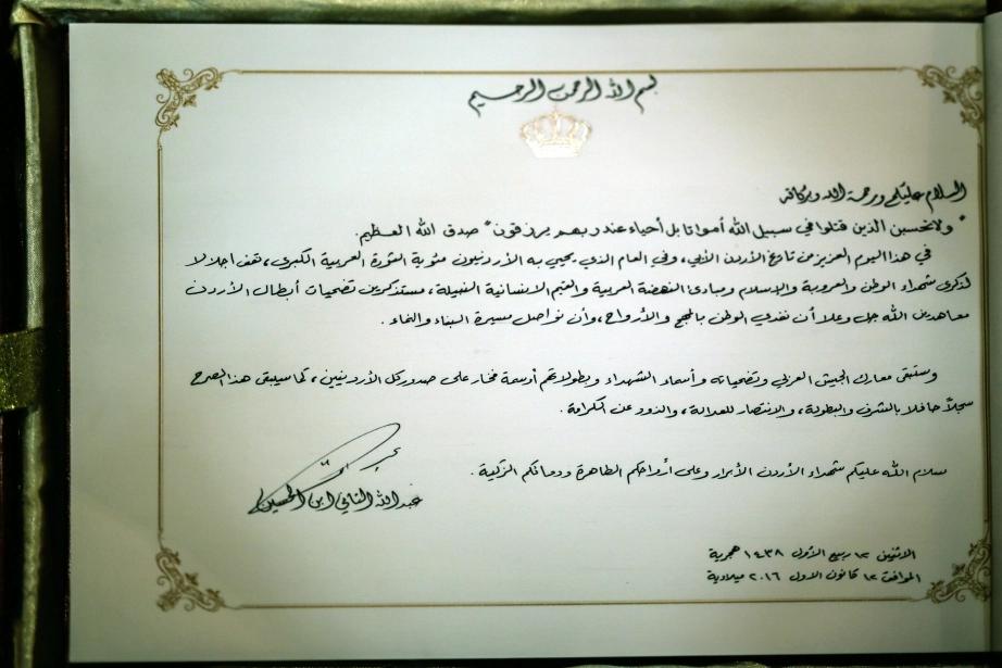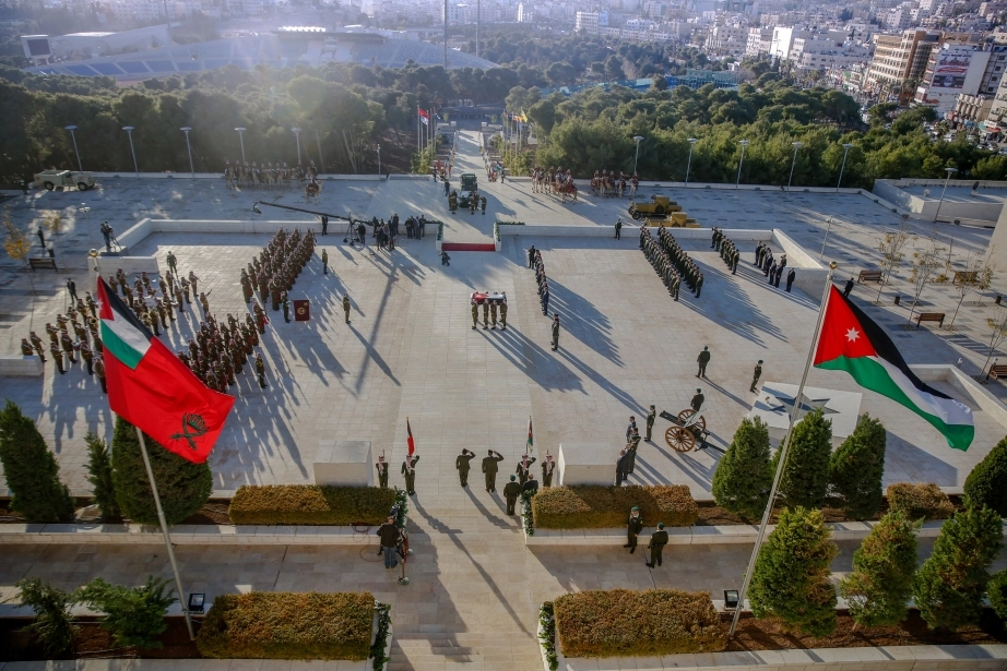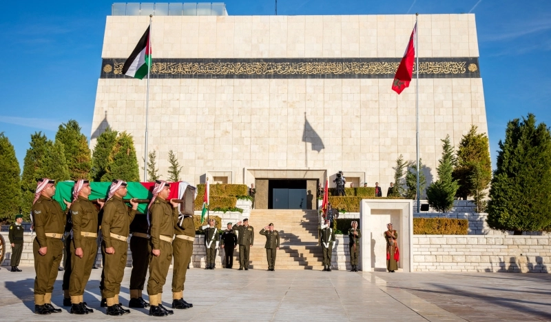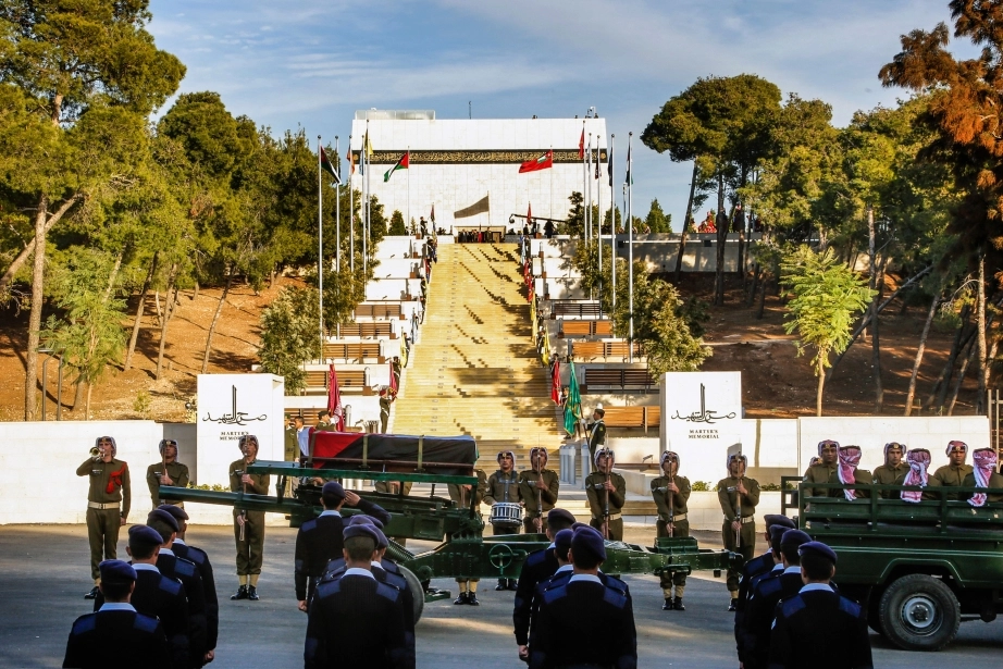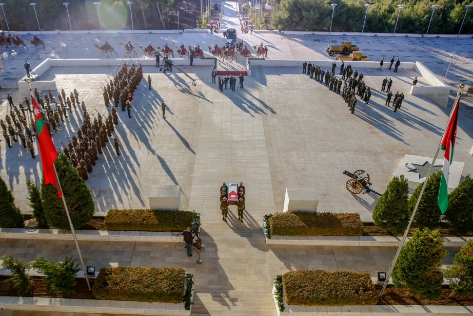 His Majesty King Abdullah II, the Supreme Commander of the Jordan Armed Forces-Arab Army, attends a burial ceremony with full military honours for the remains of a martyr from the battles of Jerusalem at the Martyr’s Memorial