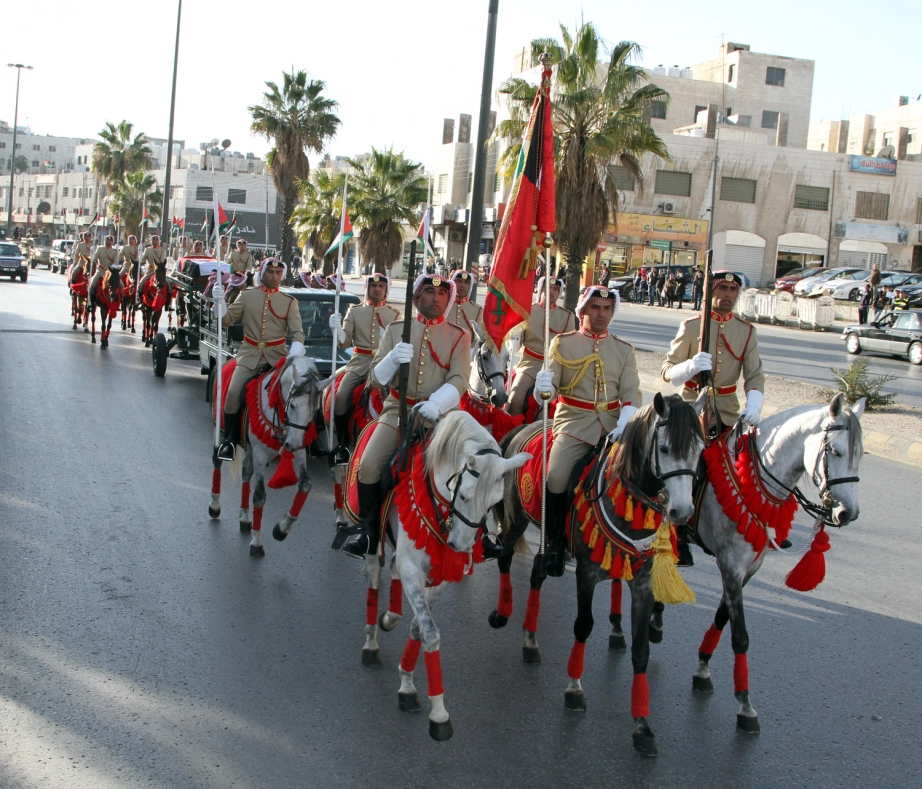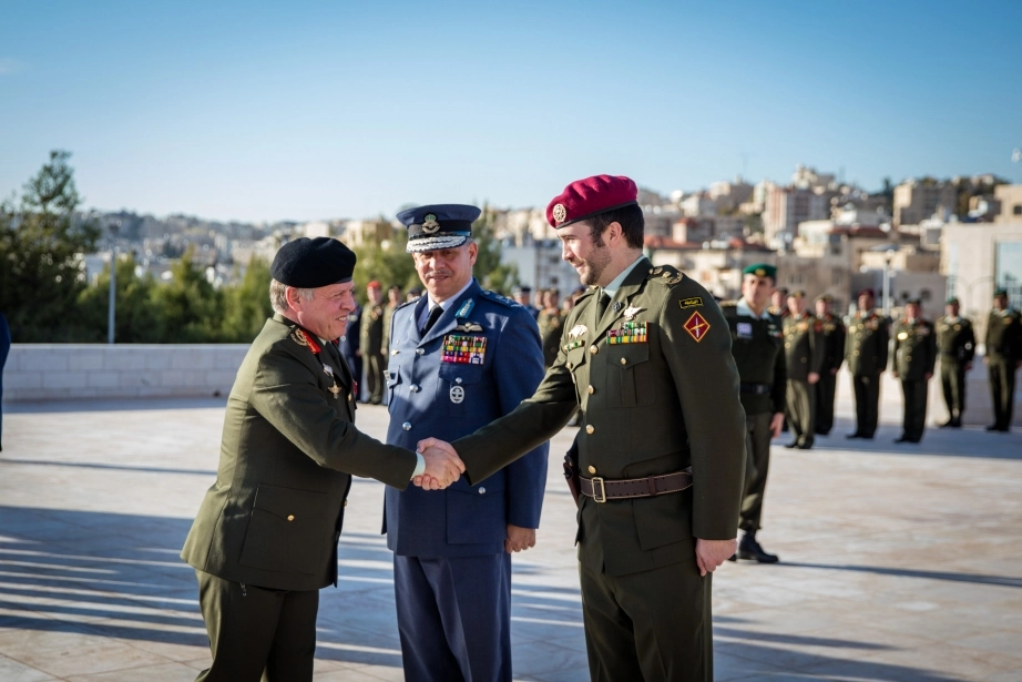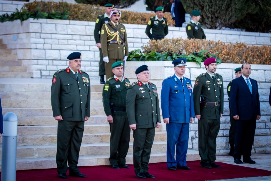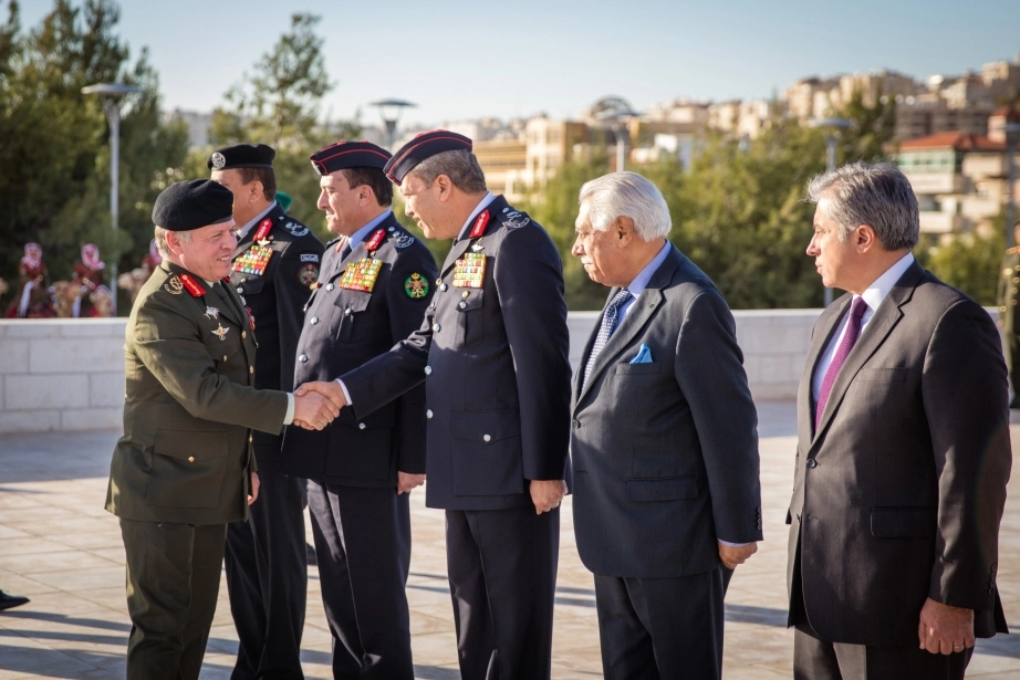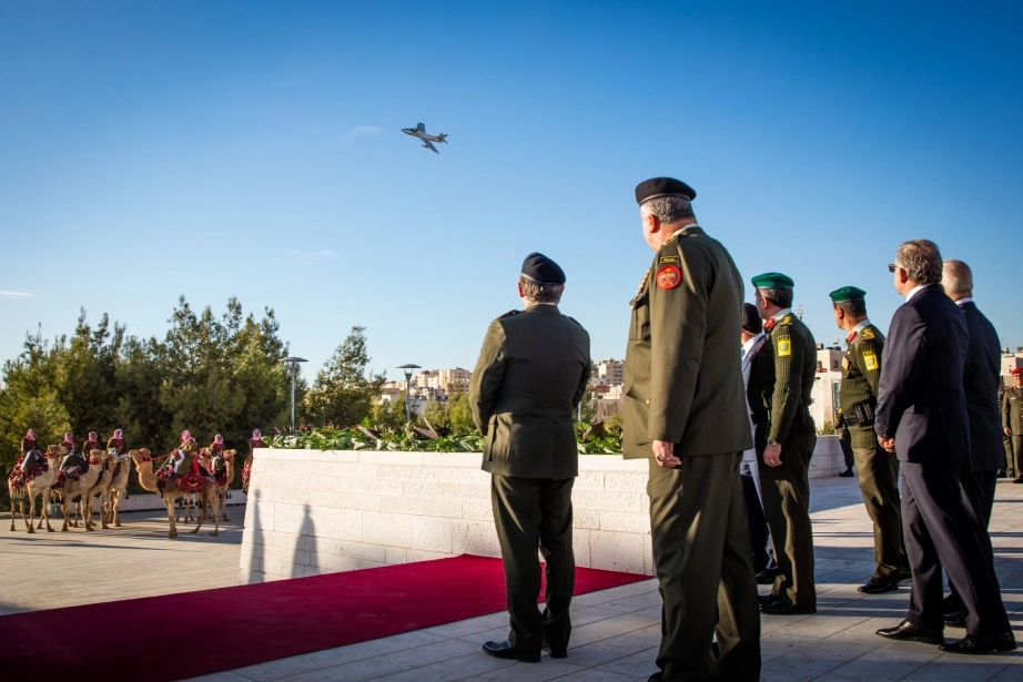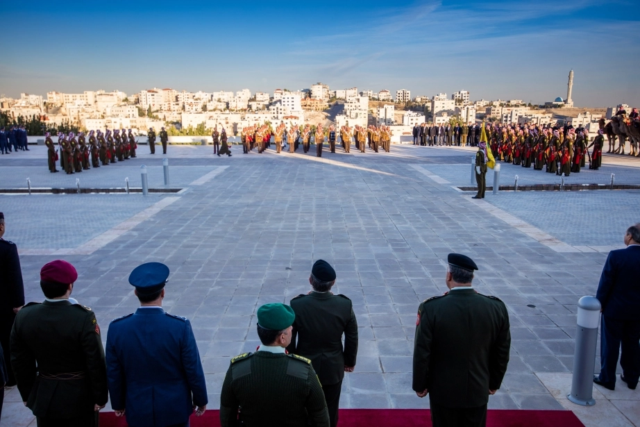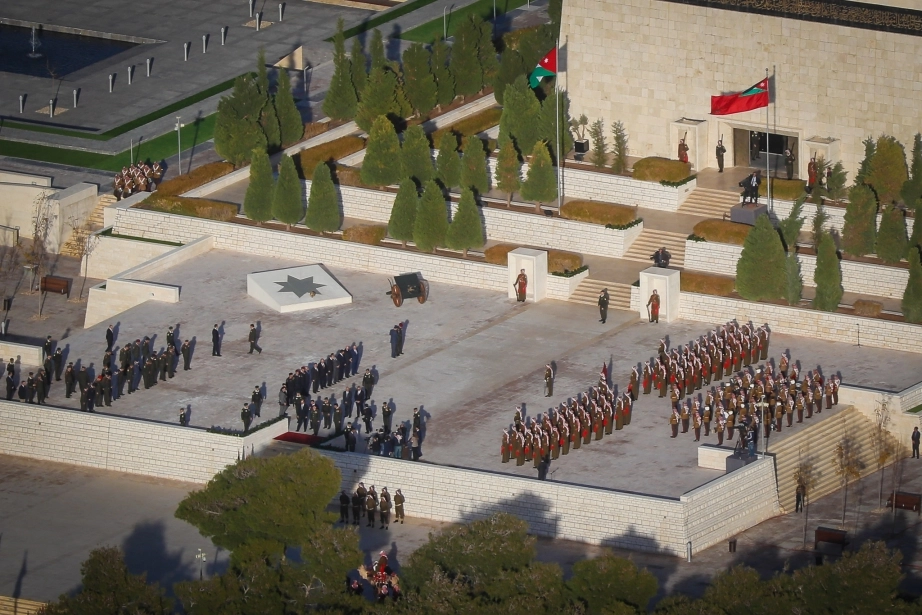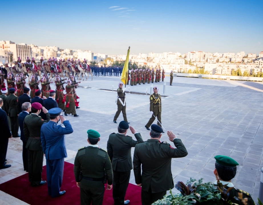 His Majesty King Abdullah II, the Supreme Commander of the Jordan Armed Forces-Arab Army, witnesses the changing of the guard ceremony at the Martyr’s Memorial