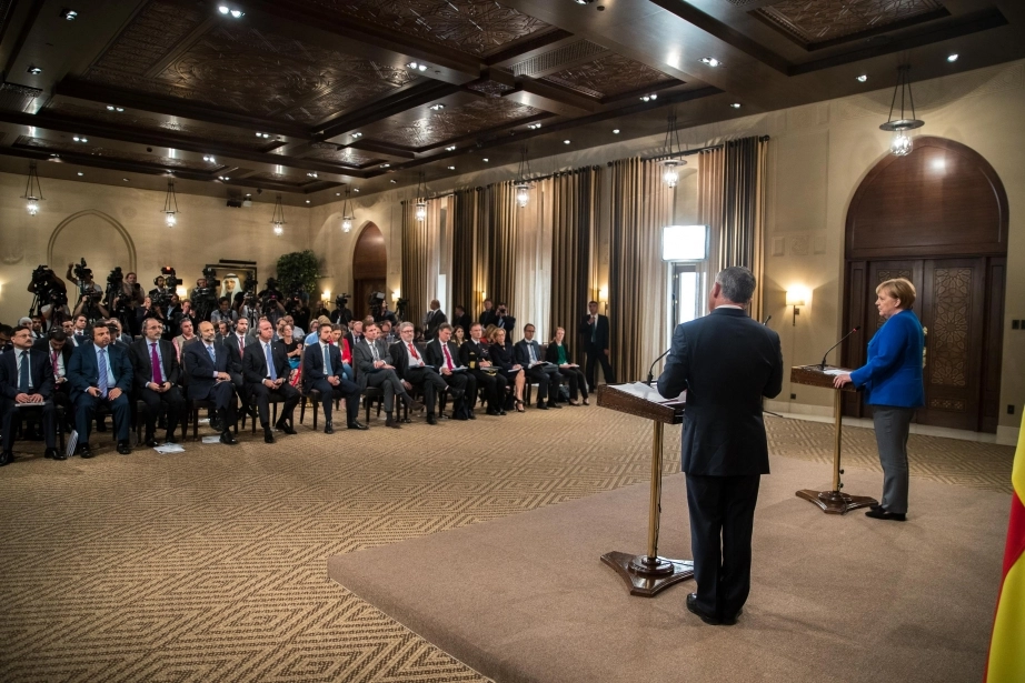 His Majesty King Abdullah II and German Chancellor Angela Merkel deliver remarks to the press