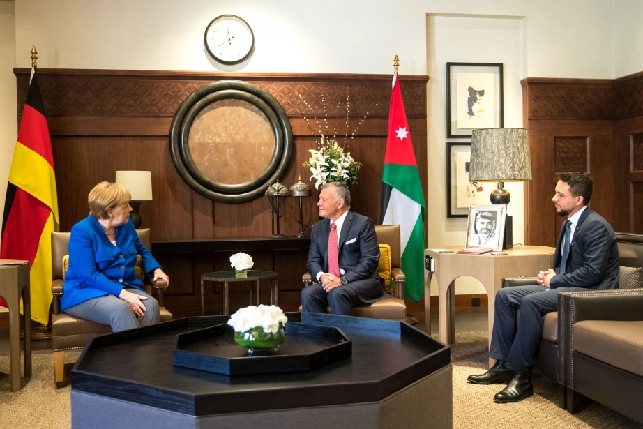 His Majesty King Abdullah II, accompanied by His Royal Highness Crown Prince Al Hussein bin Abdullah II, holds bilateral talks with German Chancellor Angela Merkel at Al Husseiniya Palace