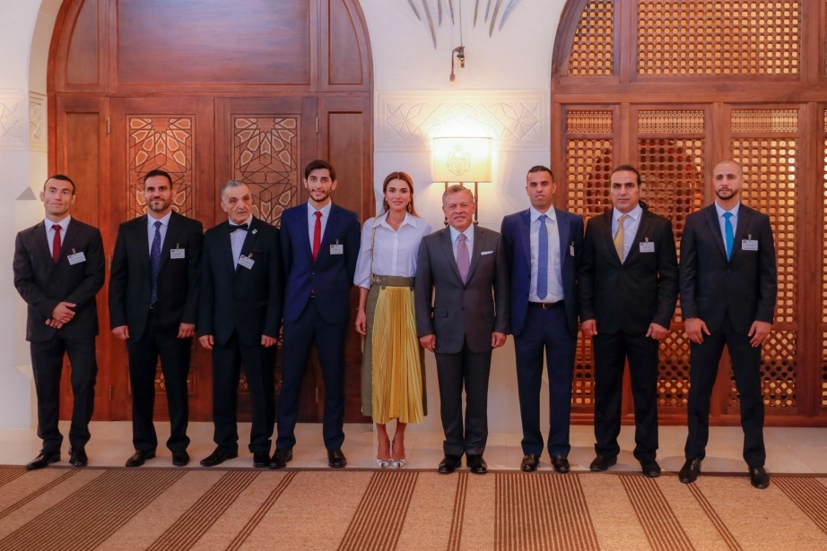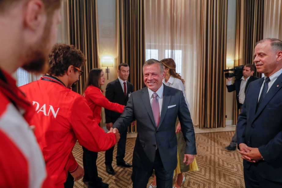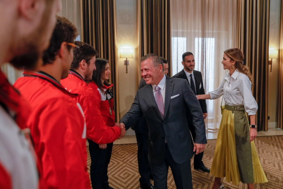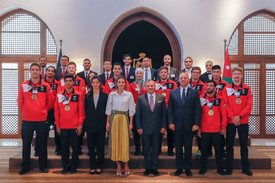 His Majesty King Abdullah II, accompanied by Her Majesty Queen Rania Al Abdullah, receives the national martial arts sports team that participated in the 18th Asian Games, winning 12 medals