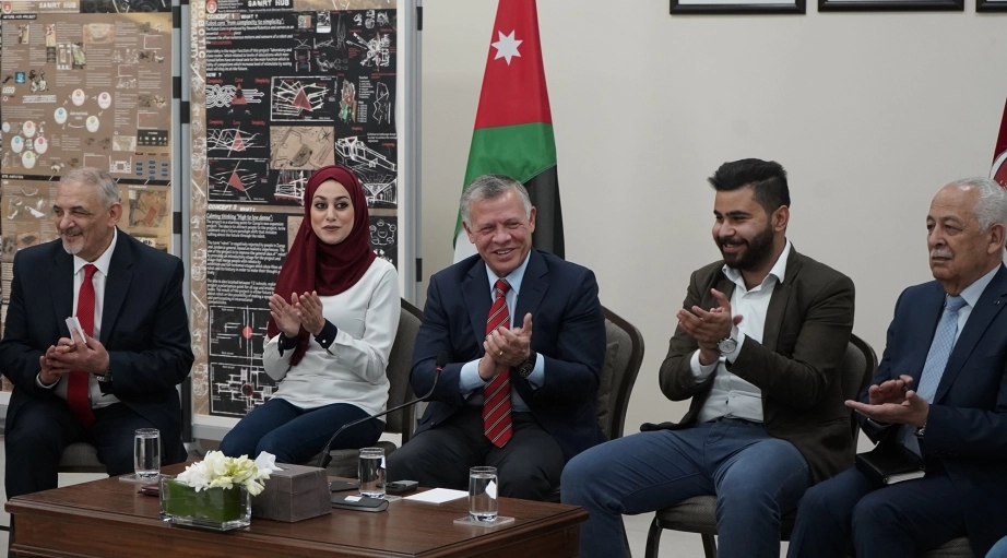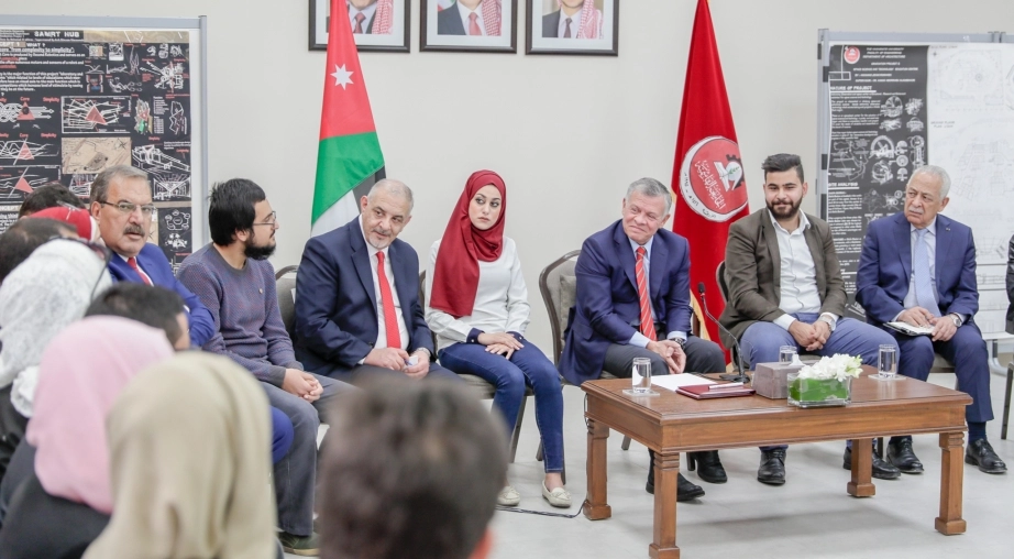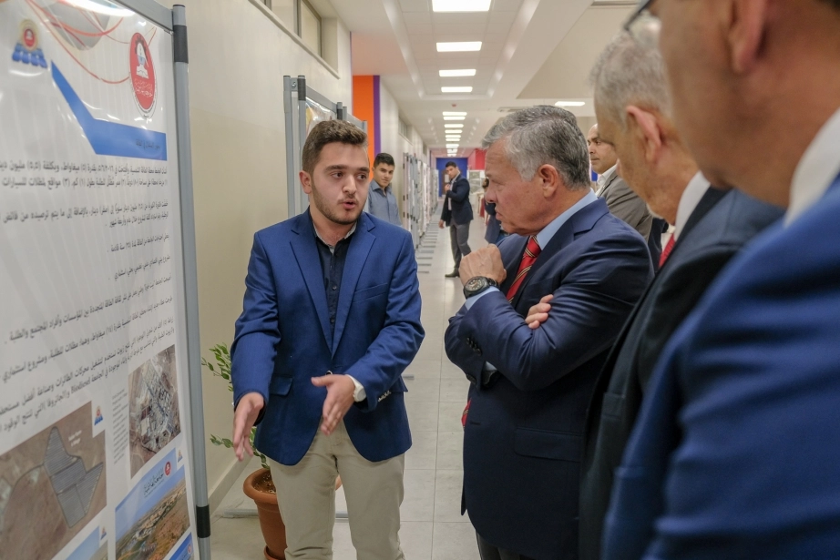 His Majesty King Abdullah II is briefed on projects by students at the Hashemite University