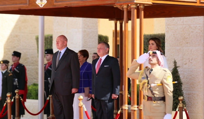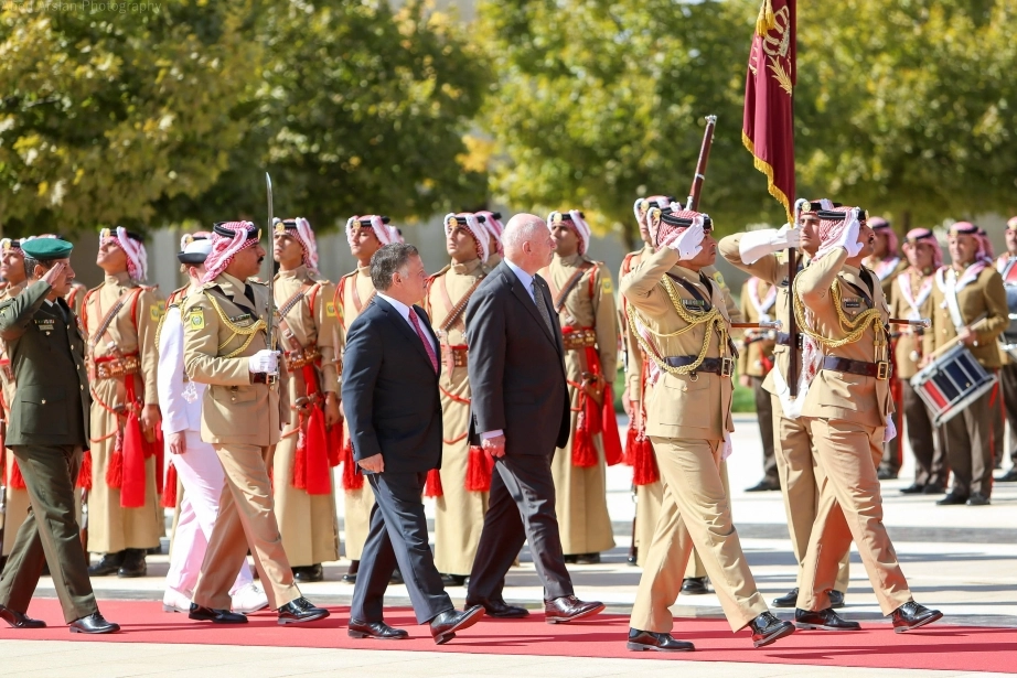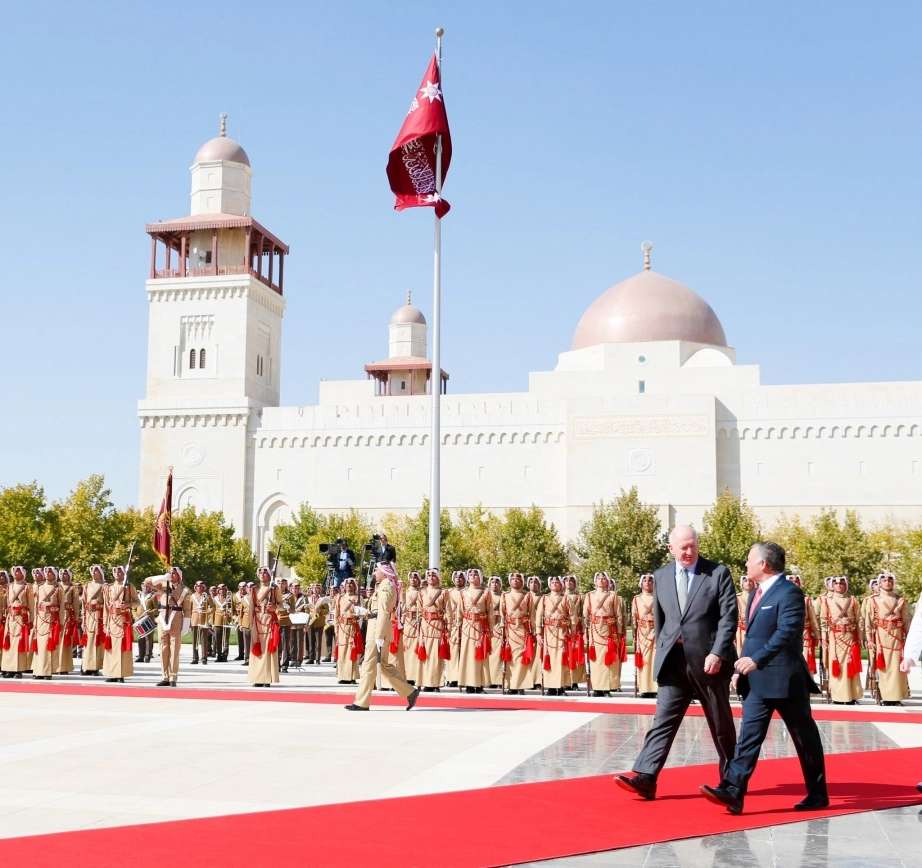 His Majesty King Abdullah II, accompanied by Her Majesty Queen Rania Al Abdullah and His Royal Highness Crown Prince Al Hussein bin Abdullah II, receives Governor General of Australia Peter Cosgrove and Lady Cosgrove at Al Husseiniya Palace