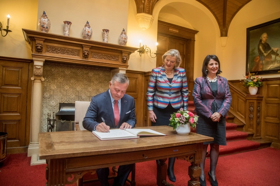 His Majesty King Abdullah II signs the guestbook at the parliament of the Netherlands