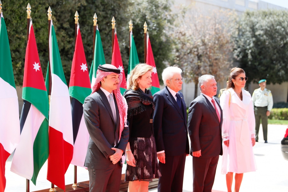Their Majesties King Abdullah II and Queen Rania Al Abdullah, and His Royal Highness Crown Prince Al Hussein bin Abdullah II receive President of Italy Sergio Mattarella and First Lady Laura Mattarella at Al Husseiniya Palace