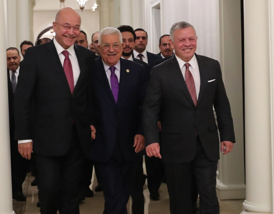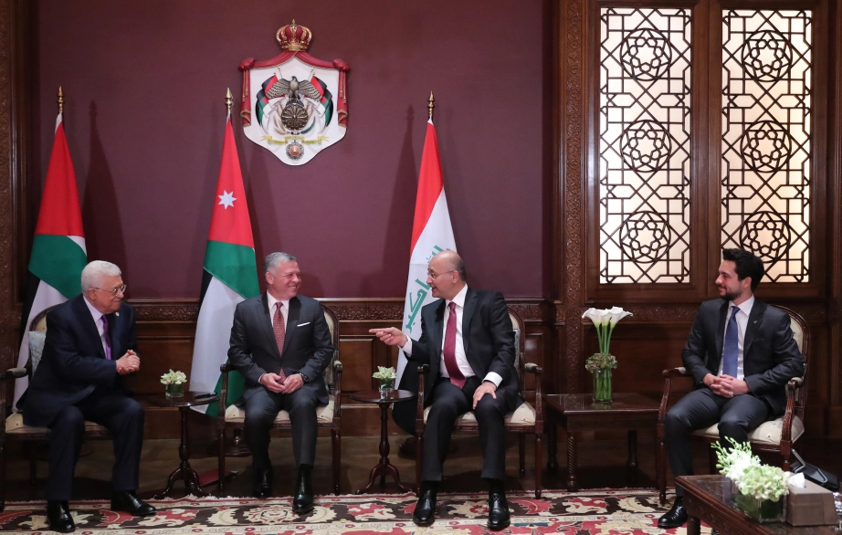 His Majesty King Abdullah II, accompanied by His Royal Highness Crown Prince Al Hussein bin Abdullah II, holds a trilateral meeting with Palestinian President Mahmoud Abbas and President of Iraq Barham Salih