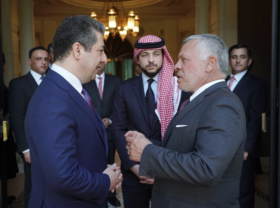 His Majesty King Abdullah II, accompanied by His Royal Highness Crown Prince Al Hussein bin Abdullah II, receives Prime Minister of the Kurdistan Region in Iraq Masrour Barzani at Basman Palace