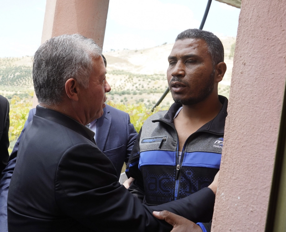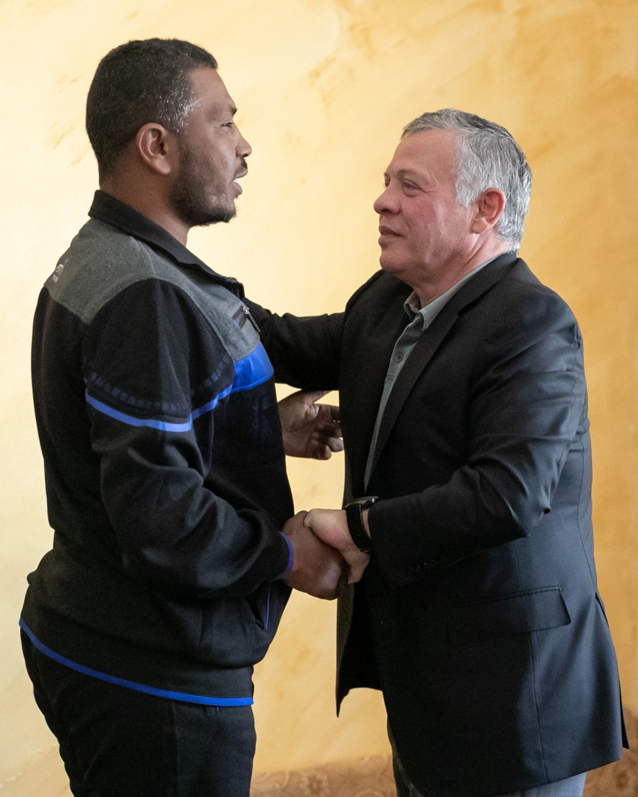 His Majesty King Abdullah II pays a surprise visit to injured serviceman Mohammad Barahmeh at his house in Al Mukheiba town and checks on his condition