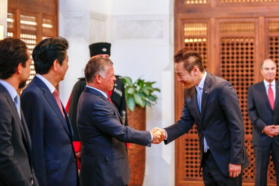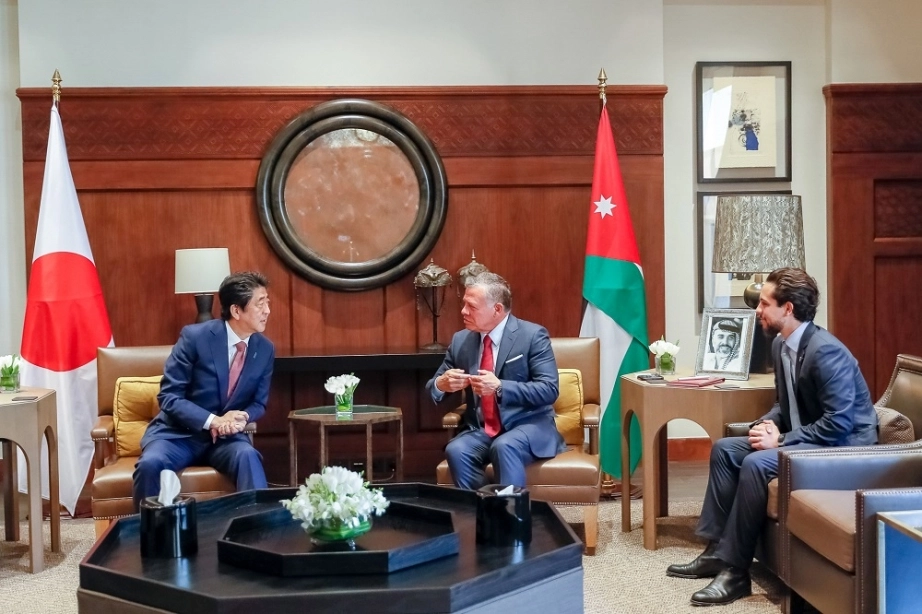 His Majesty King Abdullah II and His Royal Highness Crown Prince Al Hussein bin Abdullah II receive Prime Minister of Japan Shinzo Abe at Al Husseiniya Palace