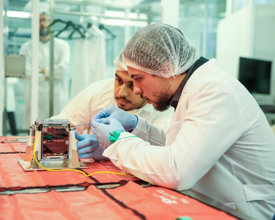 His Royal Highness Crown Prince Al Hussein bin Abdullah II inspects the final stages of a project to launch Jordan's first nanosatellite