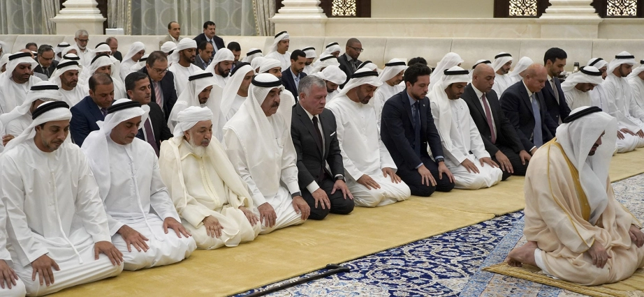 His Majesty King Abdullah II, His Royal Highness Crown Prince Al Hussein bin Abdullah II, and Sheikh Mohamed bin Zayed Al Nahyan, the Crown Prince of Abu Dhabi and Deputy Supreme Commander of the UAE Armed Forces perform maghreb prayer