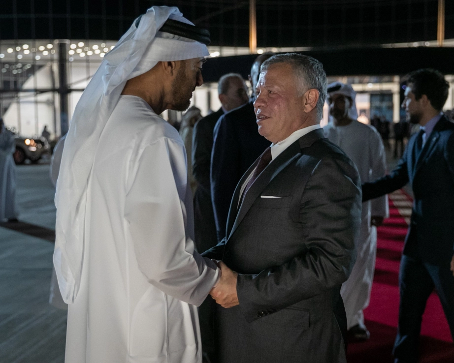 His Majesty King Abdullah II and His Royal Highness Crown Prince Al Hussein bin Abdullah II are received by Sheikh Mohamed bin Zayed Al Nahyan, the Crown Prince of Abu Dhabi and Deputy Supreme Commander of the UAE Armed Forces, at the airport in Abu Dhabi