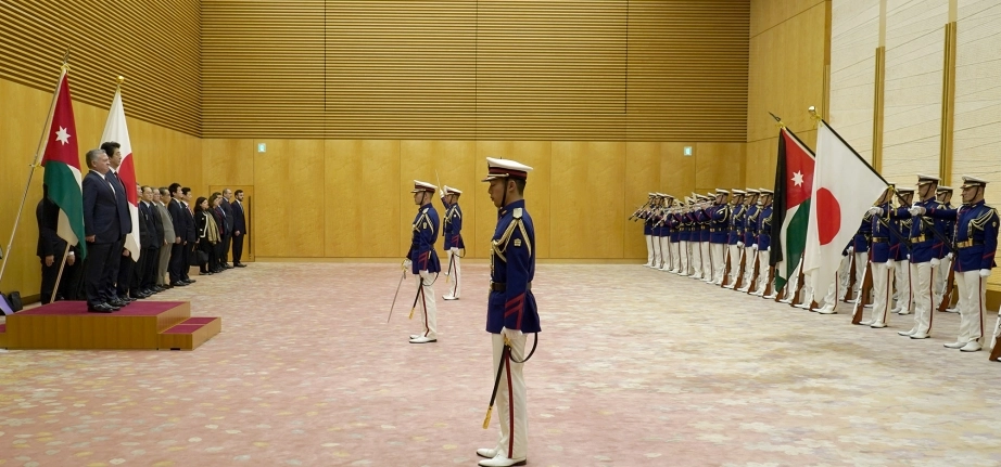 His Majesty King Abdullah II is received by Japanese Prime Minister Shinzo Abe at the Prime Ministry in Tokyo