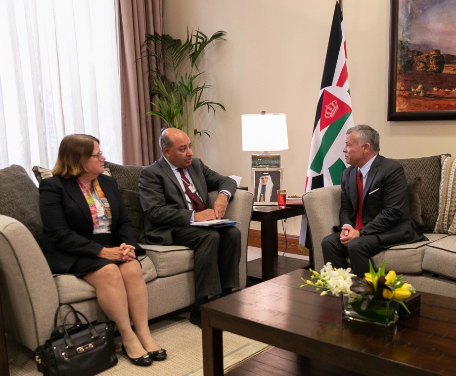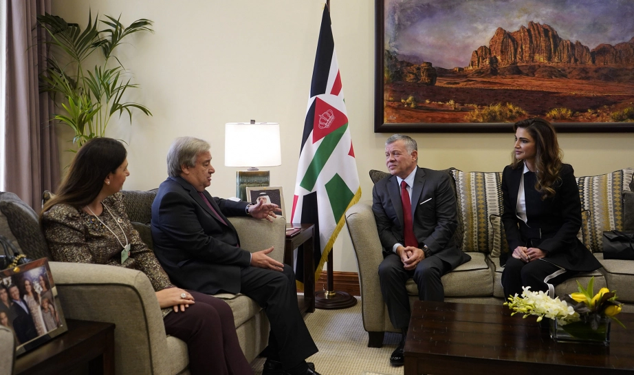 His Majesty King Abdullah II, accompanied by Her Majesty Queen Rania Al Abdullah and His Royal Highness Crown Prince Al Hussein bin Abdullah II, meets with United Nations Secretary General António Guterres