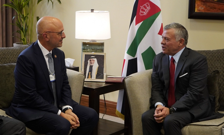 His Majesty King Abdullah II meets with Lebanese Minister of National Defence Elias Bou Saab, on the sidelines of the WEF on the Middle East and North Africa, to discuss bilateral ties and regional developments