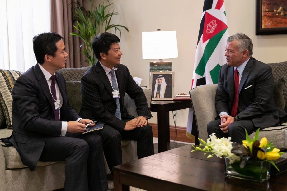 His Majesty King Abdullah II, accompanied by His Royal Highness Crown Prince Al Hussein bin Abdullah II, meets with Deputy Chairman of the Board and Rotating Chairman of Huawei Guo Ping
