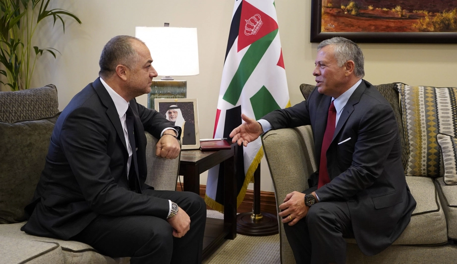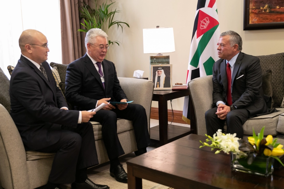 His Majesty King Abdullah II, accompanied by His Royal Highness Crown Prince Al Hussein bin Abdullah II, meets with Foreign Minister Kazakhstan Beibut Atamkulov