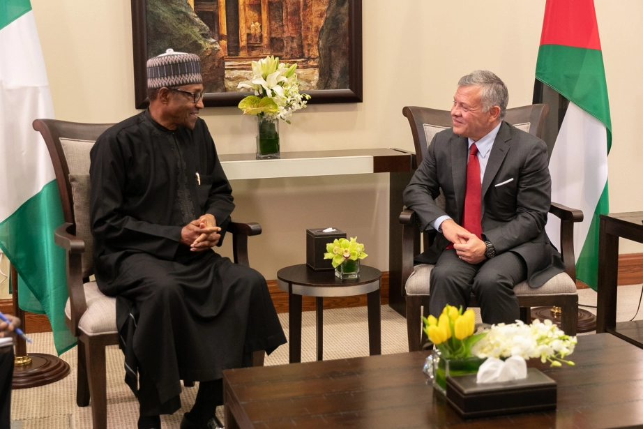 His Majesty King Abdullah II meets with President of Nigeria Muhammadu Buhari on the sidelines of the World Economic Forum on the Middle East and North Africa