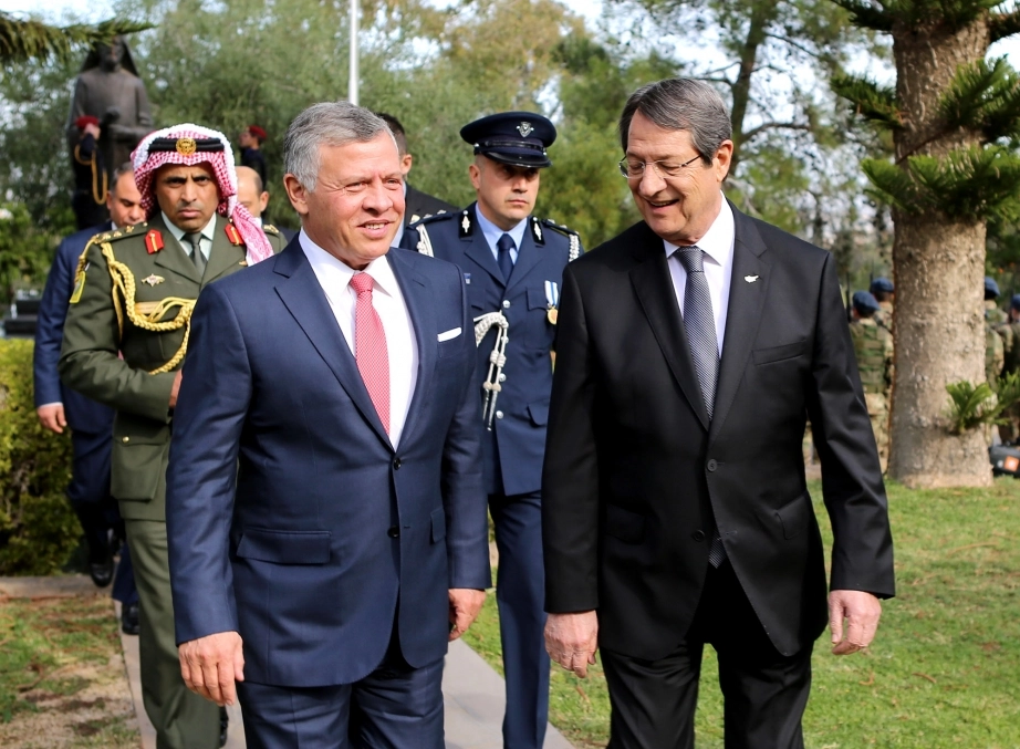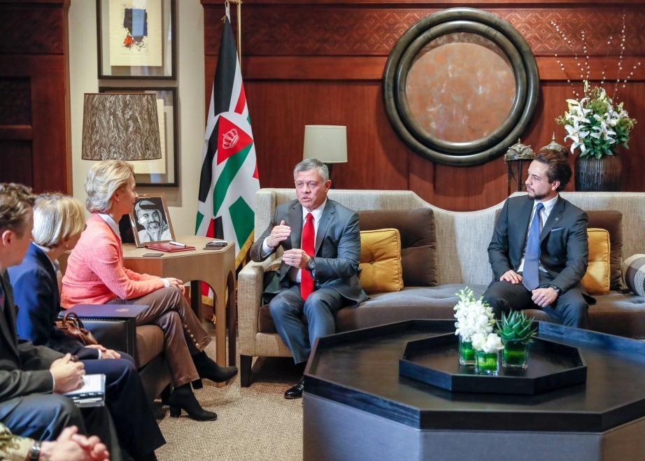 His Majesty King Abdullah II, accompanied by HRH Crown Prince Al Hussein bin Abdullah II, receives German Defence Minister Ursula von der Leyen