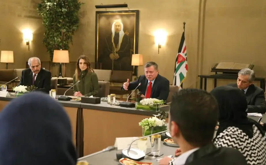 His Majesty King Abdullah II, accompanied by Her Majesty, meets with a group of Jordanian youth