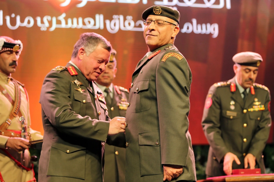 His Majesty the Supreme commander of Jordanian Armed Forces, Accompanied by Her Majesty Queen Rania Al Abdullah and HRH Crown Prince Al Hussein, hands the Hashemites flag to the Chairman of the Joint Chiefs of Staff, Gen. Mashal Mohammad Zaben